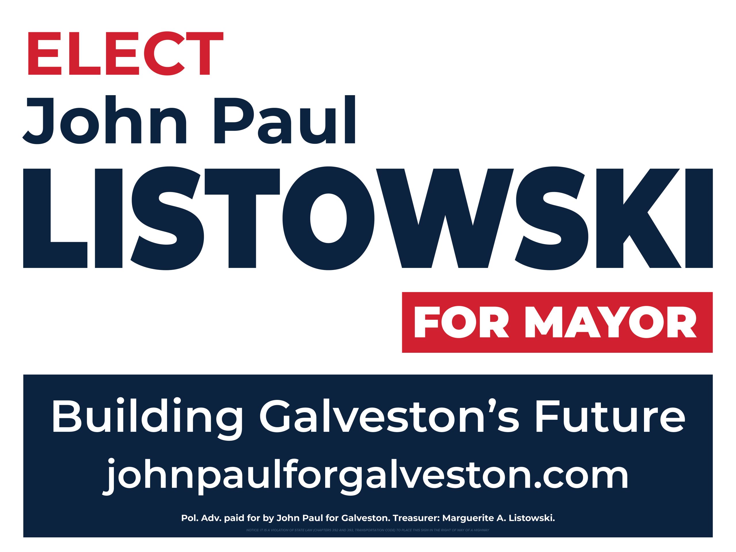 Get the latest updates from John Paul Listowski’s campaign delivered straight to your inbox. From community events to issue updates, you’ll be the first to know how to get involved and help make a difference in Galveston’s future.